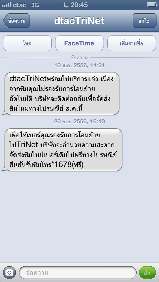 ถึง FB Dtac หลังจากได้รับ SMS "dtac trinet พร้อมให้บริการแล้ว เนื่องจากซิมของคุณไม่รองรับโอนย้ายอัตโนมัติ บริษัทจะติดต่อกลับเพื่อจัดส่งซิมหใม่ทางไปรษณีย์ ส.ค.นี้".(ข้อความนี้เห็นได้กันเกือบ