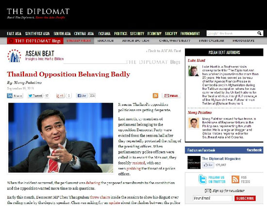 เว็บไซต์ ดิโพลแมต ซึ่งเป็นวารสารออนไลน์เกี่ยวกับการเมืองในภูมิภาคเอเชียแปซิฟิก ได้เผยแพร่บทความชื่อ พรรคฝ่ายค้านของไทยกระทำตัวหยาบคาย (Thailand Opposition Behaving Badly) เขียนโดยนายม็อง พาลาติโน นักเขียนและอดีตนักการเมืองรุ่นเยาว์ชาวฟิลิปปินส์