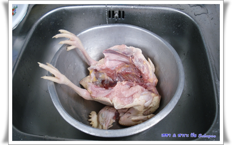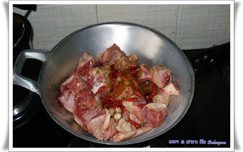 หลังจากเผา ล้าง ขัด แช่น้ำ ไว้ครึ่งวัน เมื่อวานก็เอามาประเดิม เมนูแรก คั่วไก่แดง ซึ่งซื้อมากจากกาดเสาร์เช่นกัน