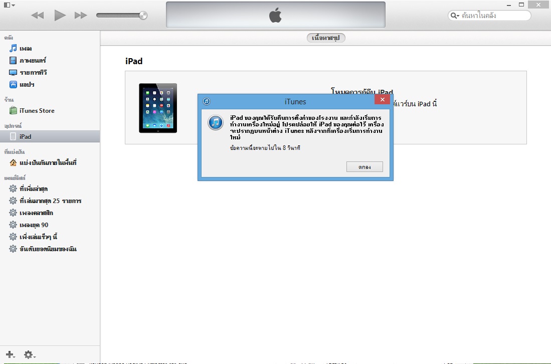 3. เข้าขั้นตอนการ Restore ตามปรกติ นั่งเฝ้า iTune ไว้เมื่อเสร็จจะขึ้นนับถอยหลังมาตามภาพ