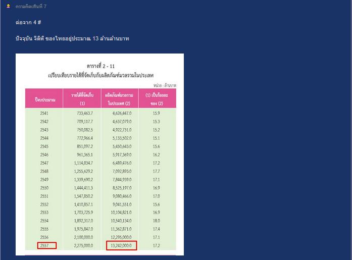 คำถามคือ ไทย สามารถกู้เกินร้อยเปอร์เซ็นต์ของ GDP ได้ไหม เมื่อเทียบ สหรัฐ ญี่ปุ่น ตามกูรูท่านนี้บอกไว้(ที่จริงเป็นไปไม่ได้นอกจาก ขนาดเศรฐกิจ และ ความแข้มแข็งทางเศรฐกิจ ความสามารถในการชำระหนี้ และอื่นๆ แต่กล่าวไปก็อยากให้หลายท่านเข้าใจ รบกวนท่านกูรูด้านเศรษฐศาสตร์ การบริหารหนี้รัฐ หนี้สาธารณะ มาให้ความรู้ เพื่อให้บางคนที่เข้าใจผิดๆทราบข้อมูลด้วยครับ