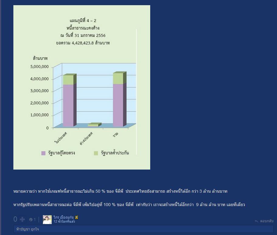 กันยายน 2554 ยอดหนี้สาธารณะรวมประมาณ 4.45 ล้านล้านบาท ยอด GDP ประมาณ 10.67 ล้านล้านบาท กันยายน 2556 ยอดหนี้สาธารณะรวมประมาณ 5.43 ล้านล้านบาท ยอด GDP ประมาณ 11.94 ล้านล้านบาท คิดเป็นยอดหนี้สาธารณะเพิ