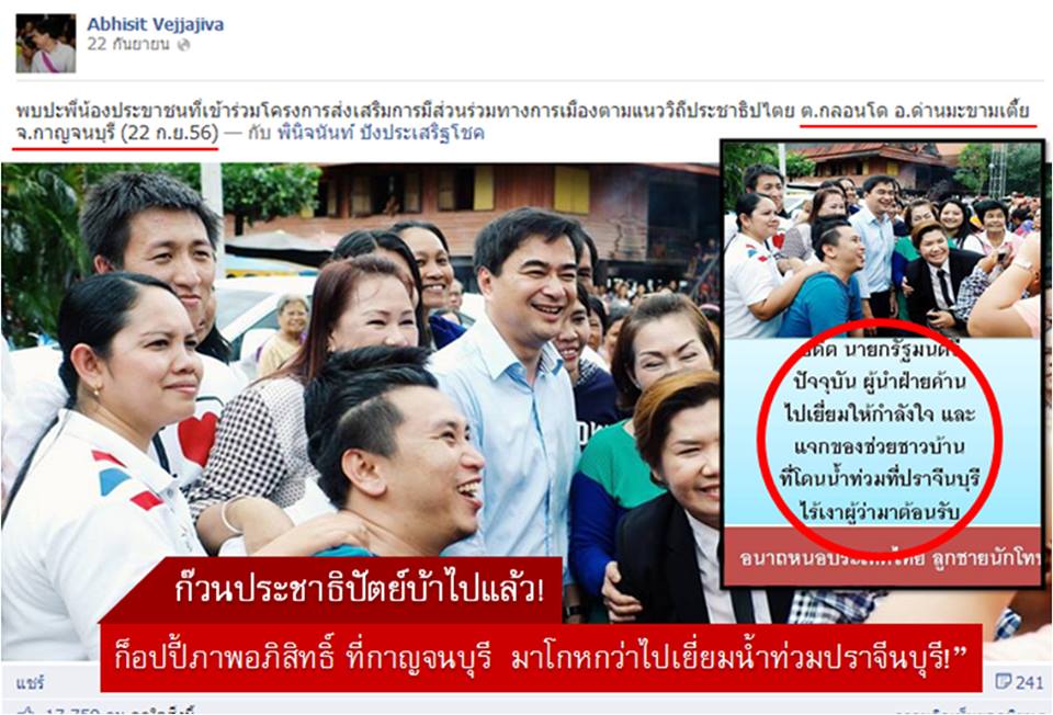 ฮาทั้งเมือง ! ก๊วนประชาธิปัตย์ ก็อปปี้ภาพเก่าที่กาญจนบุรี มาโกหกคนทั้งโลกว่า "มาร์ค" ไปช่วยน้ำท่วมปราจีน พิษริษยา "พานทองแท้" ที่ไปเยี่ยมน้ำท่วมปราจีนบุรี ทนไม่ได้ถึงขนาด