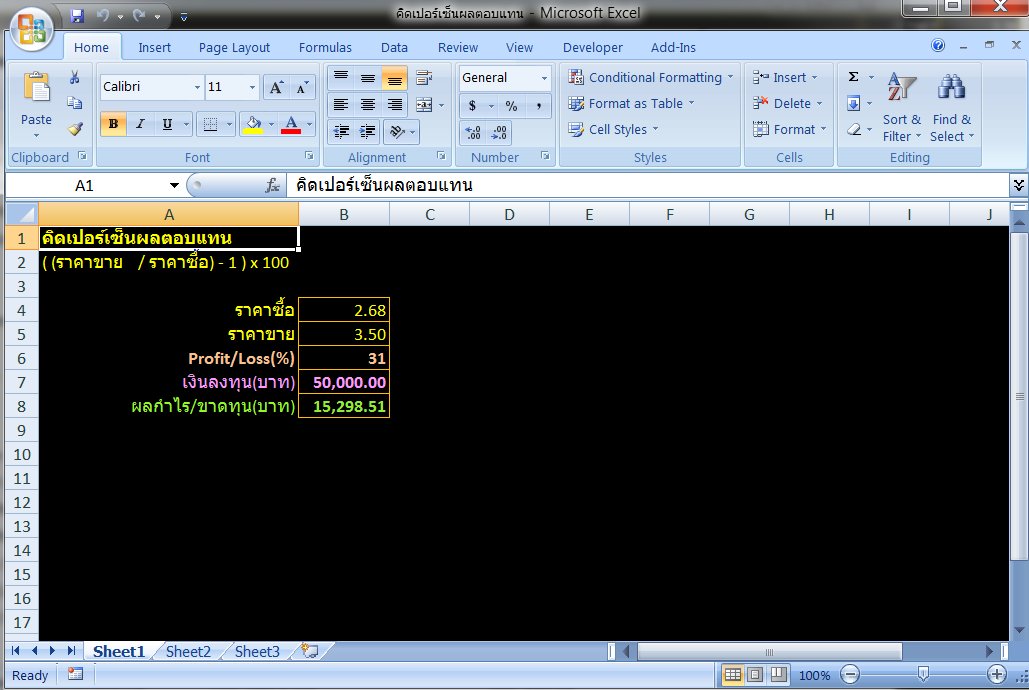 อยากรู้ว่าราคาต้นทุนที่เราซื้อมาและขายไป กำไร/ขาดทุน กี่ % เพียงแค่ใส่ตัวเลขในช่อง ดังนี้