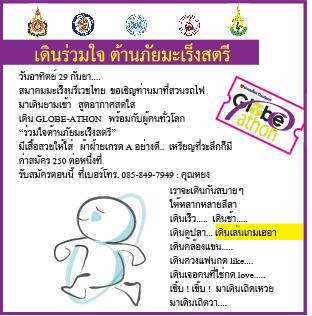 อย่าลืมนะค่ะช่วยกันชวนญาติพี่น้องเพื่อนๆ มาร่วมกิจกรรมการกุศล “เดินร่วมใจต้านภัย มะเร็งสตรี Globe-athon” ที่สวนวชิรเบญจทัศ (สวนรถไฟ) วันอาทิตย์ที่ 29 กันยายน 2556 เวลา 05.30-10.00 น. โดยพร้อมเพรียงกัน