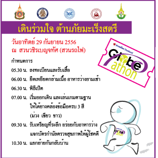 เชิญชวน เพื่อนๆพี่ๆน้องๆ ทุกท่าน เข้าร่วมกิจกรรมการรณรงค์ ภายใต้โครงการ “Globe-athon 2013: The Walk to End Women's Cancer” โดยกำหนดจัดการเดิน- วิ่งในวันเดียวพร้อมกันกับมวลชนอีกกว่า 80 ประเทศทั่วโลก ในนาม“เดินร่วมใจต้านภัยมะเร็งสตรี” ซึ่งจ้ดที่สวนวชิรเบญจทัศ (สวนรถไฟ) กรุงเทพมหานคร ในวันอาทิตย์ที่ 29 กันยายน 2556 เวลา 05:30-10:30 น.
