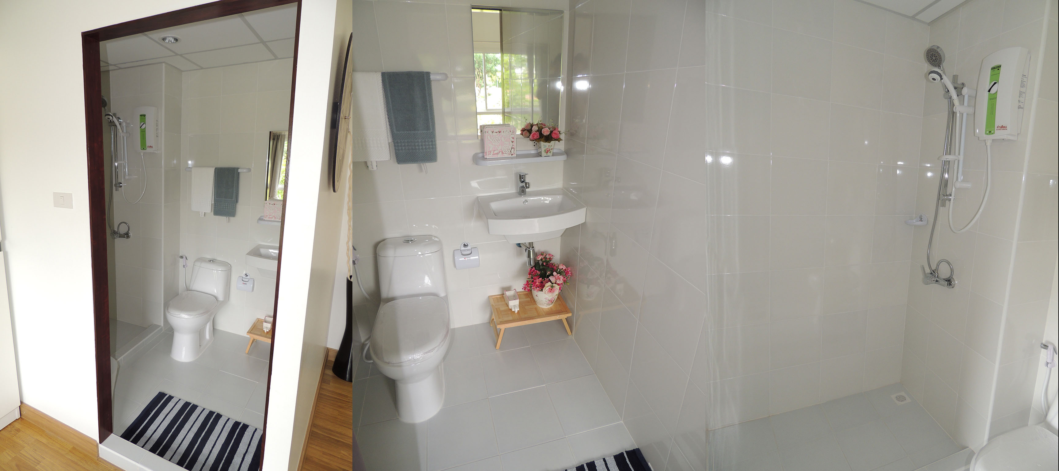 มาดูห้องน้ำบ้าง พื้นผนังกระเบื้องธรรมดา สุขภัณฑ์ cotto ต้องบิ้วชั้นวางของและกั้นฉากอาบน้ำเพิ่มเองค่ะ