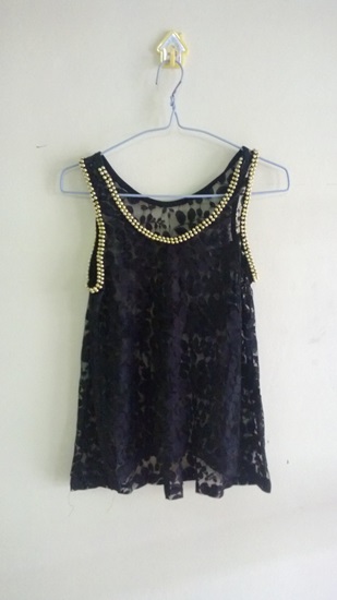 3.ไม่เคยใส่จ้า เสื้อกล้ามลูกไม้สีดำ ขอบแขนมีตุ้มทองติดอยู่รอบๆค่ะ ขาย 70 บาท