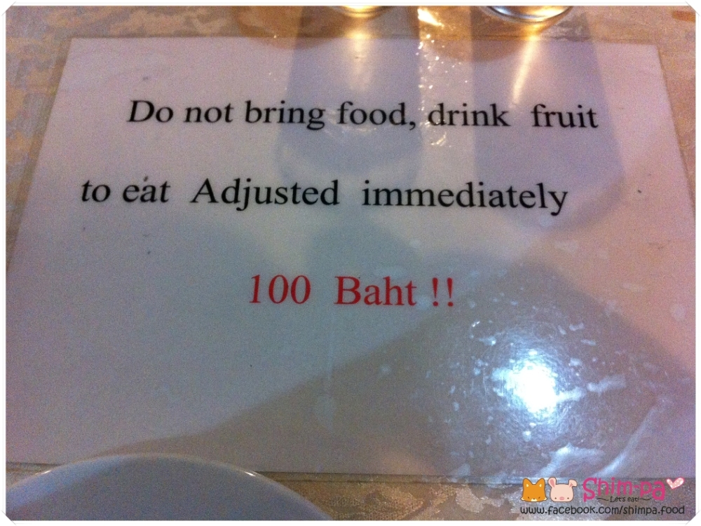 โอ๊ะ! มีป้ายเตือนว่า ห้ามเอาอะไรข้างนอกมาทานในร้านนะจ้ะ ไม่งั้นโดนปรับแน่!!!