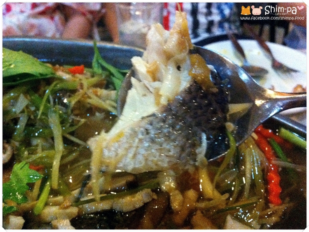 จานสุดท้าย "ปลากระพงนึ่งบ๊วย" แทบมองไม่เห็นปลา เพราะให้เครื่องมาเยอะมากกกก...
