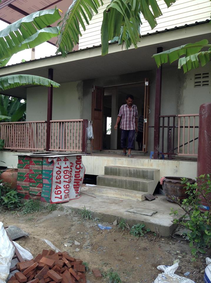 บ้านไม้ชั้นเดียว อายุบ้าน 60 ปี พื้นที่ตัวบ้านประมาณ 60 ตารางเมตร ประตูไม้แบบบานเฟื้ยม หลังคากระเบื้องลอนคู่ ไม่มีฝ้าเพดาน มีห้องนอน 1 ห้อง ที่เหลือเป็นพื้นที่โล่ง พื้นปูนมีระดับต่ำกว่าถนน น้ำฝนมักไหล