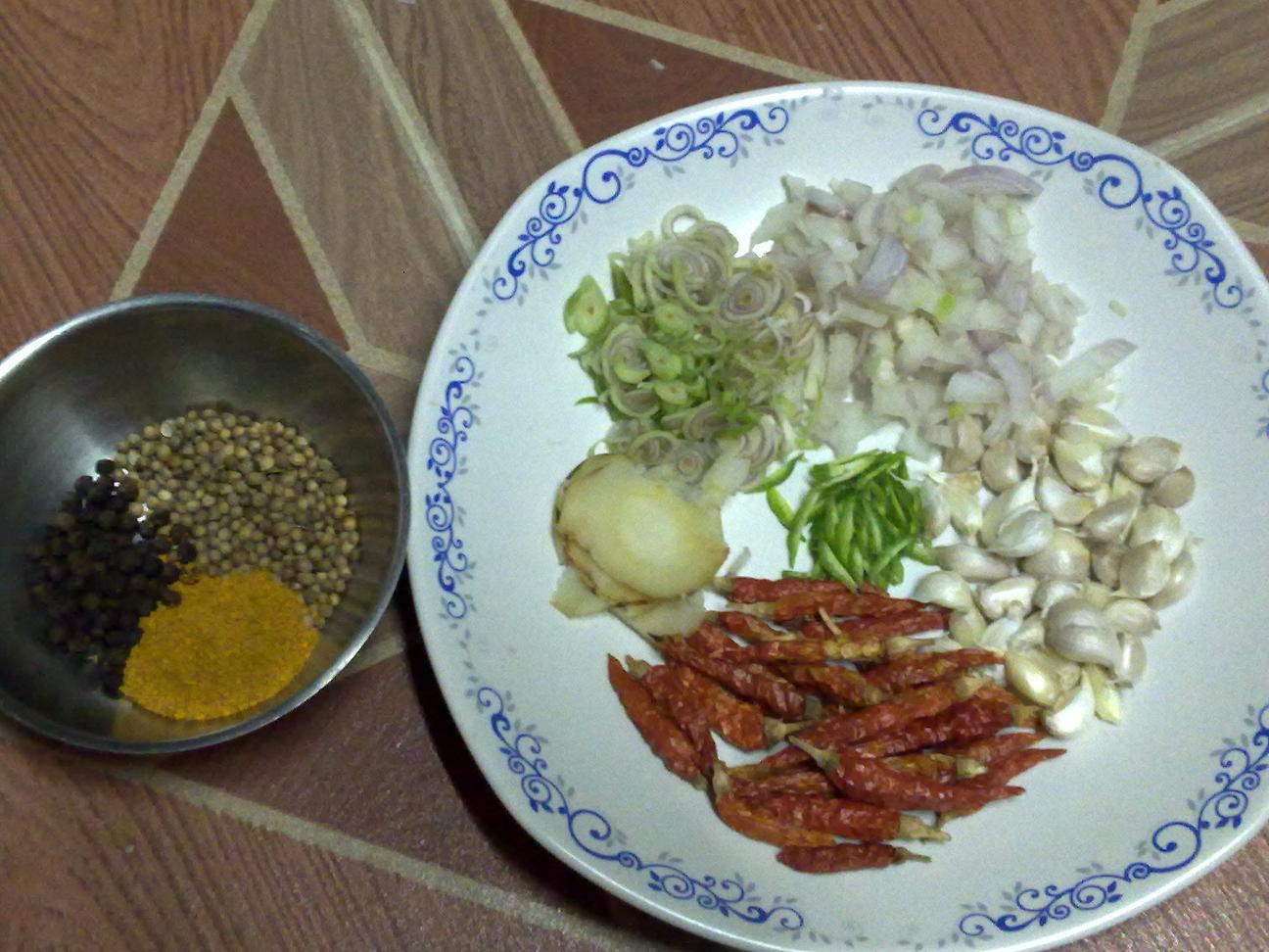 พริกแห้ง หอมแดง(มากหน่อย) กระเทียม ตะไคร้ ข่านิดหน่อย ผิวมะกรูด ลูกผักชี พริกไทย ขมิ้น ผงมะสะหล่า(ลืมรูป แหะๆๆ)