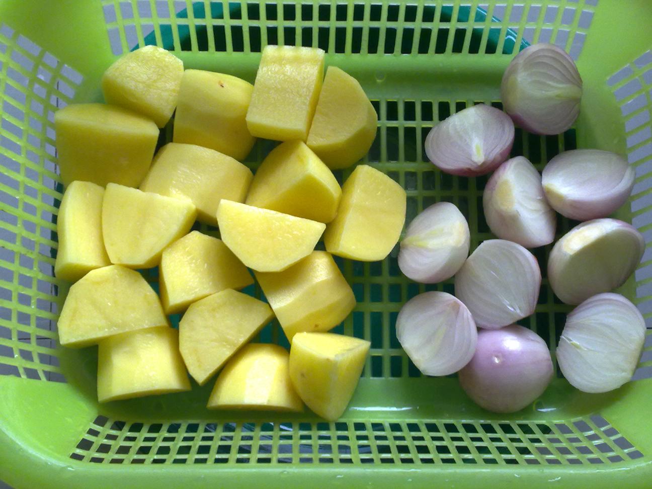 มันฝรั่งหรือมันเทศก็ได้ครับ สำหรับผมมันเทศอร่อยกว่าแต่วันนี้หาไม่ได้ แล้วก็หอมแดงพม่าครับ