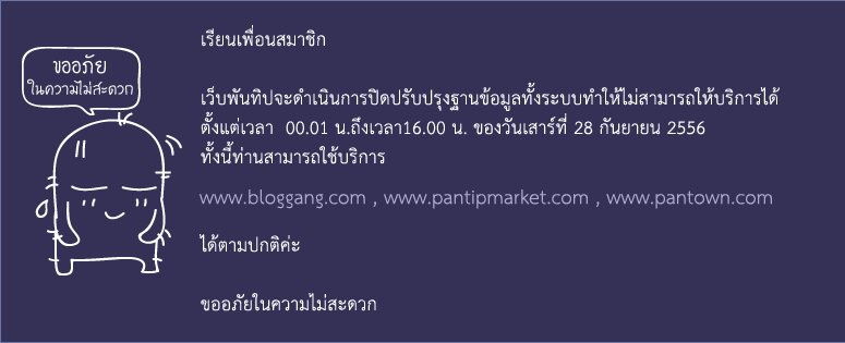 เรียน เพื่อนสมาชิก เนื่องด้วยวันอังคาร ที่ 18 พฤศจิกายน 2557 ทางเว็บไซต์ pantip.com จะดำเนินการปรับปรุงระบบบางส่วนซึ่งจะมีผลกระทบให้เข้าใช้งานในบางส่วนไม่ได้ชั่วคราว(ประมาน 1 วัน) เช่น - pantown - คล