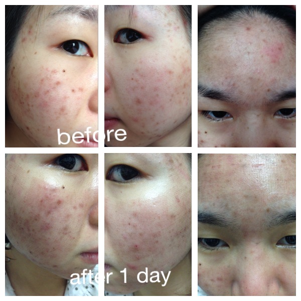 สังเกตทั้งหน้าเป็นลายตารางเลยค่า หน้ายังแดงอยู่เลย ^^! วันเดียวอาจจะยังไม่เห็นความเปลี่ยนแปลงมาก อีก 2-3 วันคิดว่าน่าจะตกสะเก็ดและเยินกว่านี้ค่ะ แต่สังเกตดูรอยดำแห้งและเล็กลงนะ แต่ทั้งนี้ทั้งนั้น ต้องรอดูอีกซัก 1-2 อาทิตย์ค่ะ ว่าหน้าจะเป็นยังไง รอก่อนนะคะ จะโพสเรื่อยๆจ้า