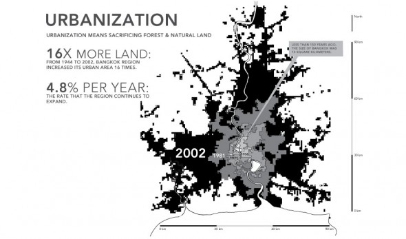 ภาพการขยายตัวของกรุงเทพฯ เดิมเราคิดว่าตัดไม้ทำลายป่าและเกษตรกรรมคือสาเหตของการสูญเสียป่าไม้ แต่ปัจจุบันการขยายตัวของเมืองและการปรับตัวของอุตสาหกรรมกลับเป็นปัจจัยหลัก ภาพจาก http://www.architectkidd.com/deforestation-increases-floods/