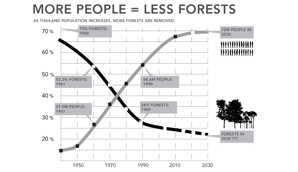 “คนมา ป่าหมด” ป่าไม้ในประเทศไทย ลดลงเนื่องจากประชากรเพิ่มขึ้น และประชากรในกรุงเทพยังมีสัดส่วนที่เพิ่มเมื่อเทียบกับประชากรนอกกรุงเทพฯ อ่าน กรุงเทพมหานคร: เมืองโตเดี่ยวตลอดกาลของประเทศไทย