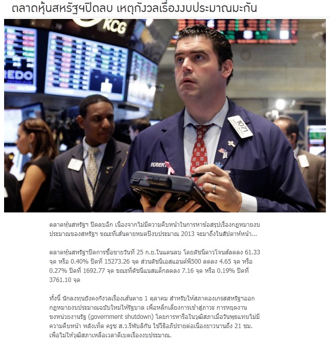 ดาวโจรลบเพราะเรื่องการผ่านร่างงบประมาณ ยังไม่เกี่ยวกับ QE , ยังไม่เกี่ยวกับตัวเลขสากกระเบือยันเรือรบทั้งหลาย , ยังไม่เกี่ยวกับซีเรีย , ยังไม่เกี่ยวกับยุโรป , จีน.......และ ปัญหาของทั้งโลก นั่นหมายถึง ความกังวลของทั้งโลกมันเชื่อมโยงกันครับ สิ่งต่างเหมือนสัญญานรบกวนในอากาศ ที่มีมาและจางหายไป เราห้ามมันไม่ได้ แต่เราสามารถอยู่ร่วมกับมันได้ครับ ถ้าเรามองสิ่งนั้นเป็นเรื่องปกติและต้องอยู่ในเกณฑ์ที่ยอมรับได้