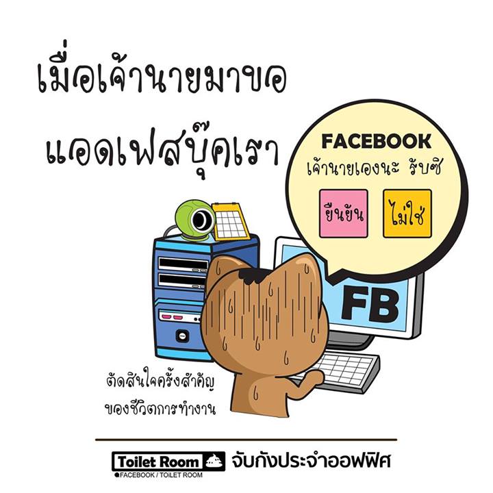 1. เมื่อเจ้านายมาขอแอดเฟซบุ๊ค โคตรจะลำบากใจ ถามว่าอยากรับมั๊ย โคตรอยากจะกดทิ้งแล้วบล็อกเลยด้วยซ้ำ แต่ถ้าไม่รับนะ พรุ่งนี้ต้องมาถามแน่ๆ ว่าทำไมไม่ยอมรับเพื่อน ชะตาขาดแน่ๆ แล้วทำไมต้องแอดมาด้วยนะ ไม่อยากกดรับเฟ้ย