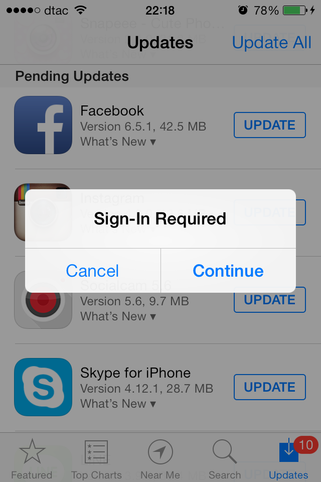 เราใช้ iPhone 5 และมี iPad 3 อีกเครื่องค่ะ ก่อนหน้านี้ก็โหลด app และ update ได้ตามปกติค่ะ จนเมื่อสัก 2 อาทิตย์ที่ผ่านมา เราพยายามกด update ใน app store มันก็จะขึ้นให้เราใส่ password ตลอด จากนั้นก็จะ