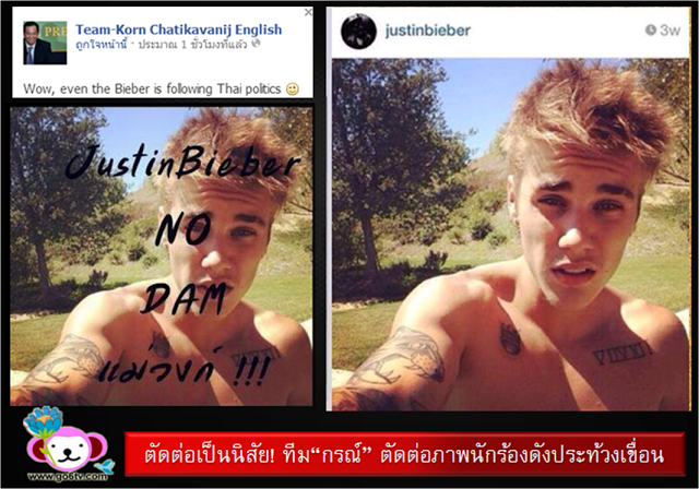 ตัดต่อเป็นอาชีพ! "ทีมกรณ์" ตัดต่อภาพนักร้องดัง Justin Bieber ใส่ข้อความประท้วงเขื่อน