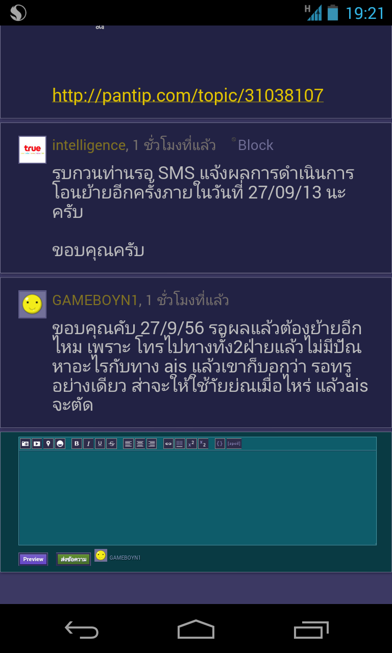 ผมได้ย้าย จาก Ais มา true ในวัน 24/9/56 วันนี้ทางทรูบอกว่าจะได้รับsmsย้าย จะได้ย้าย หรือ ทางทรูมั่วนิ่ม เอาเอง รึเปล่า เพราะ ก็ติดเสา อาทิต เว้นเรื่องอีก 2วัน แล้วจะไปจบหรือสิ้นสุดวันไหน บอกว่าล่าช้าเพราะ true ย้ายมาทรู h แล้วลูกค้าตาดำๆ ใหม่ๆ มาเจอแบบนี้ แทนที่จะได้รับความประทับใจในครั่งแรก แต่กลับมาพบกับความผิดหหวัง