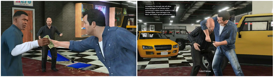 "คุณ Simeon... มันไม่ใช่อย่างที่คุณคิด" Franklin ลงจากรถพยายามแก้ตัว แต่ทุกอย่างล้มเหลวเมื่อ Michael พูดแทรกขึ้น "ฉันใจกว้างเสมอถ้ามีใครทำถูกใจ" หนุ่มใหญ่ล้วงเงินปึกนึงจากกระเป๋าส่งให้ Franklin แล้วสั่งว่า "รีบไปได้แล้วไอ้หนู" ชายผิวดำรับเงินไว้แบบงงๆ วิ่งออกจากร้านแต่โดยดี