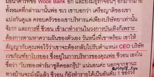 "การที่ซีวอนเข้ามาในวงการบันเทิงก็เพราะต้องการตามหาความฝันของตัวเอง วันหนึ่งที่เขาพร้อมเขาให้สัญญากับคุณพ่อไว้ว่า เขาจะต้องกลับไปรับตำแหน่ง CEO บริษัทเวชภัณฑ์ยาโบรยอง ซึ่งอยู่ในการบริหารของคุณพ่อ "