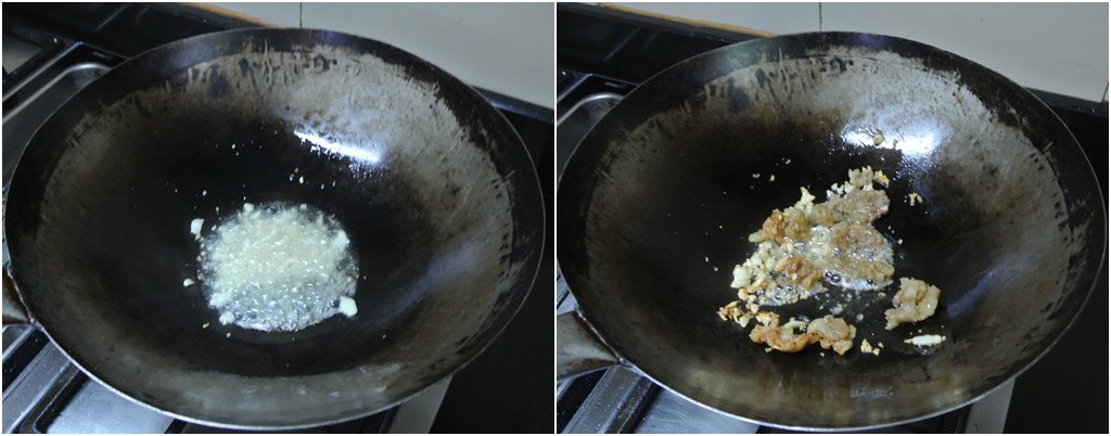 เอากระเทียมไปผัดกับน้ำมันหมู พอกระเทียมสุก ใส่กากหมูลงไป เนื่องจากมีกากหมูจากการเจียวน้ำมันหมูอยู่พอดี