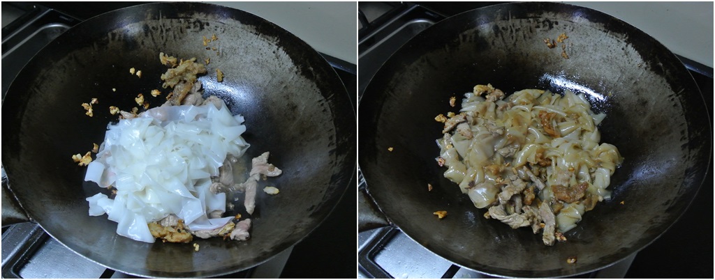 พอเนื้อสุกนิดหน่อย ใส่เส้นใหญ่ลงไปผัด คลุกให้เข้ากัน ปรุงรสด้วยซีอิ้วขาว และซีอิ้วดำนิดหน่อย