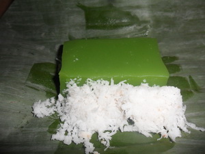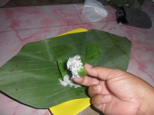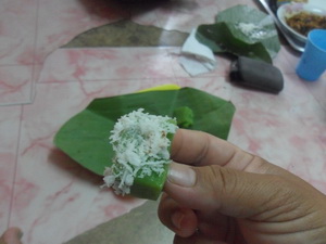 แม่ค้าเค้าแยกตัวขนมกับมะพร้าวใว้คนละห่อกัน เวลาจะกินก็เทรวมกัน