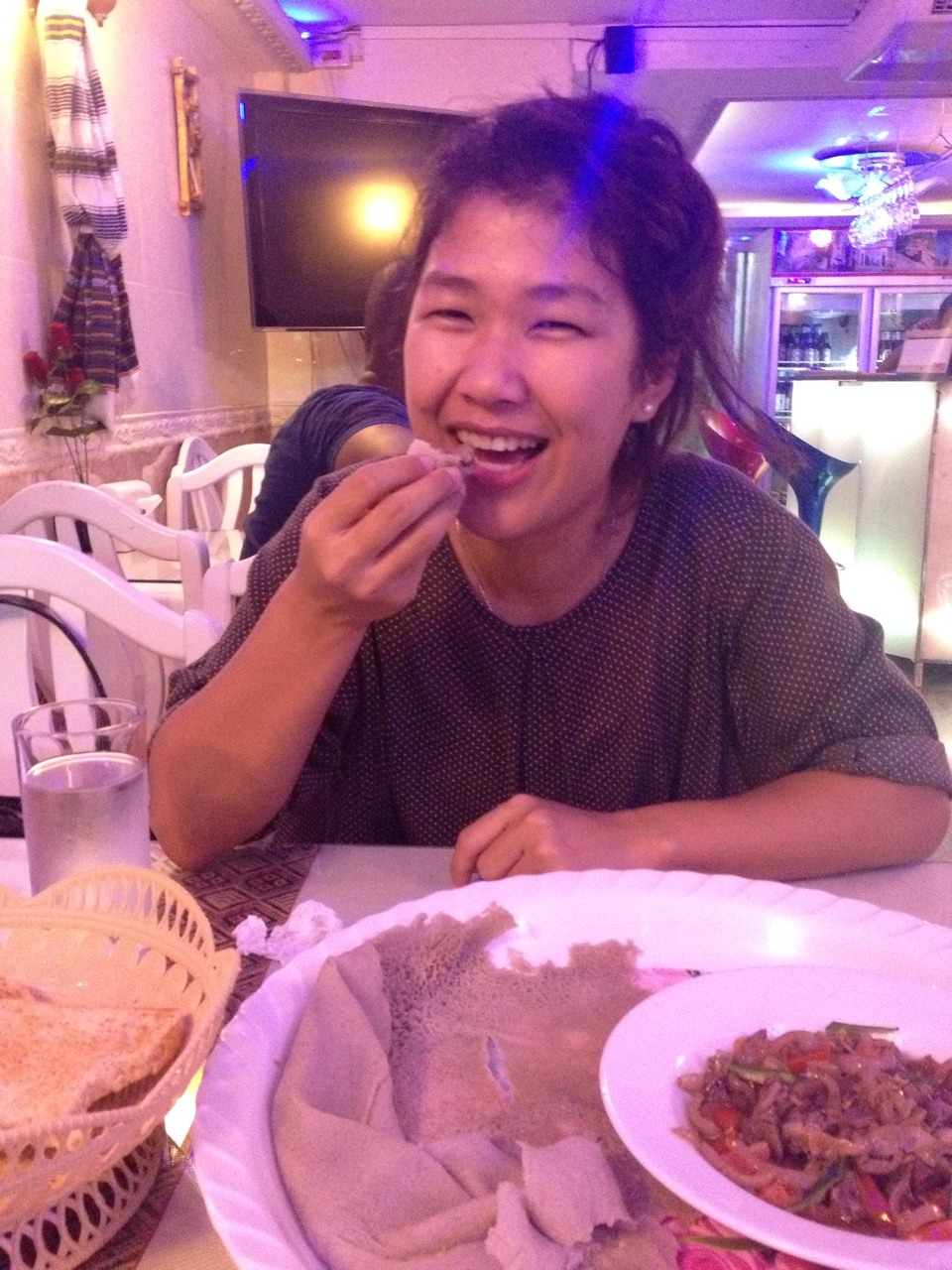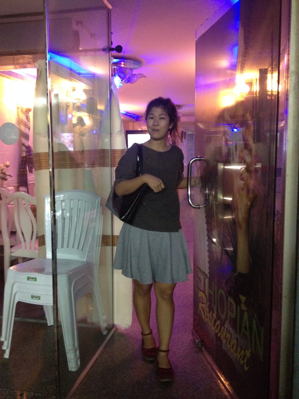 ตัดสินใจสั่งอาหารโดยถามจากพนักงานที่มาเก็บเมนูว่า ถ้าไม่กินเผ็ด ไม่กินแพะอาหารอะไรเหมาะกับเราและเพื่อนสาว ก็เลยได้เมนูนี้มา มีชื่อเรียกว่าAwaze Tibs กินกับ Injera ที่เป็นแป้งหมักรสเปรี้ยว และขนมปังปิ้ง Awaze Tibs เป็นเนื้อวัวที่ไม่มีกลิ่นสาบเลย ผัดกับผัก รสชาติเค็มนิดๆมันหน่อยๆ อร่อยมากๆ