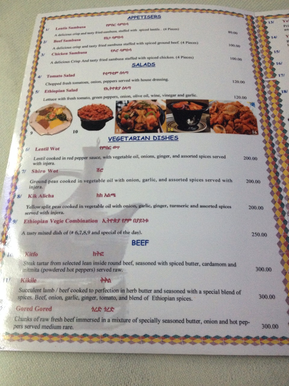 อย่างที่บอกก่อนมาเราก็หาข้อมูลของประเทศเอธิโอเปียมาคร่าวๆ รวมถึงอาหารและคำศัพท์ที่ใช้เรียกชื่ออาหารนั้นๆด้วย แต่...โอ้ววว เห็นเมนูแล้วข้อมูลที่หามาดูไร้ค่าทันที ในเมนูมีภาษาอังกฤษอธิบายกำำักับอยู่ แต่เรากับเพื่อนก็ไม่สามารถจินตนาการได้จริงๆว่าหน้าตาเป็นอย่างไร