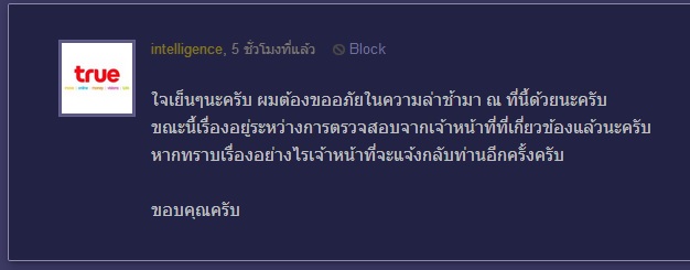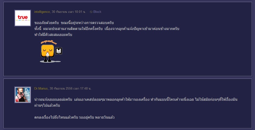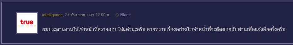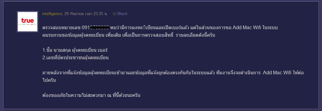 ผมเลยเข้าไปใน chat เพื่อจะแจ้ง add mac เหมือนเดิม  และผมก็เจอเหมือนเดิม พนักงานแชทแจ้งว่า ไม่สามารถทำได้ ต้องให้เจ้าของเบอร์ตัวจริงเป็นคนติดต่อ อ้าวยิ้มแล้วตรูไม่ใช้เจ้าของตรงไหน  ตกลงพนักงานแจ้งว่า มันไม่ใช้เบอร์ชื่อผม  ยังเป็นชื่อของคนอื่นเหมือนเดิม  ก็ หลังไมค์แจ้ง คุณ intelligence เช่นเคย  แต่รอบนี้ หายเงียบไป 2 วัน โผล่มาตอบวันที่ 29