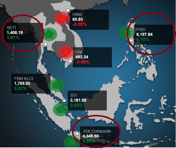 กลุ่ม TIP พี่ไทยดูดีที่สุด ฟิลิปปินส์ -2.1% จาการ์ต้า -1% ฮั่งเสง -3% ไทย + เพราะพื้นฐานเศรษฐกิจดีเกินหน้าเกินตาประเทศอื่นในเอเซีย การเมืองมีเสถียรภาพ รัฐบาลเข้มแข็ง เงินเยอะแยะมากมายขาดทุนจำนำข้าว
