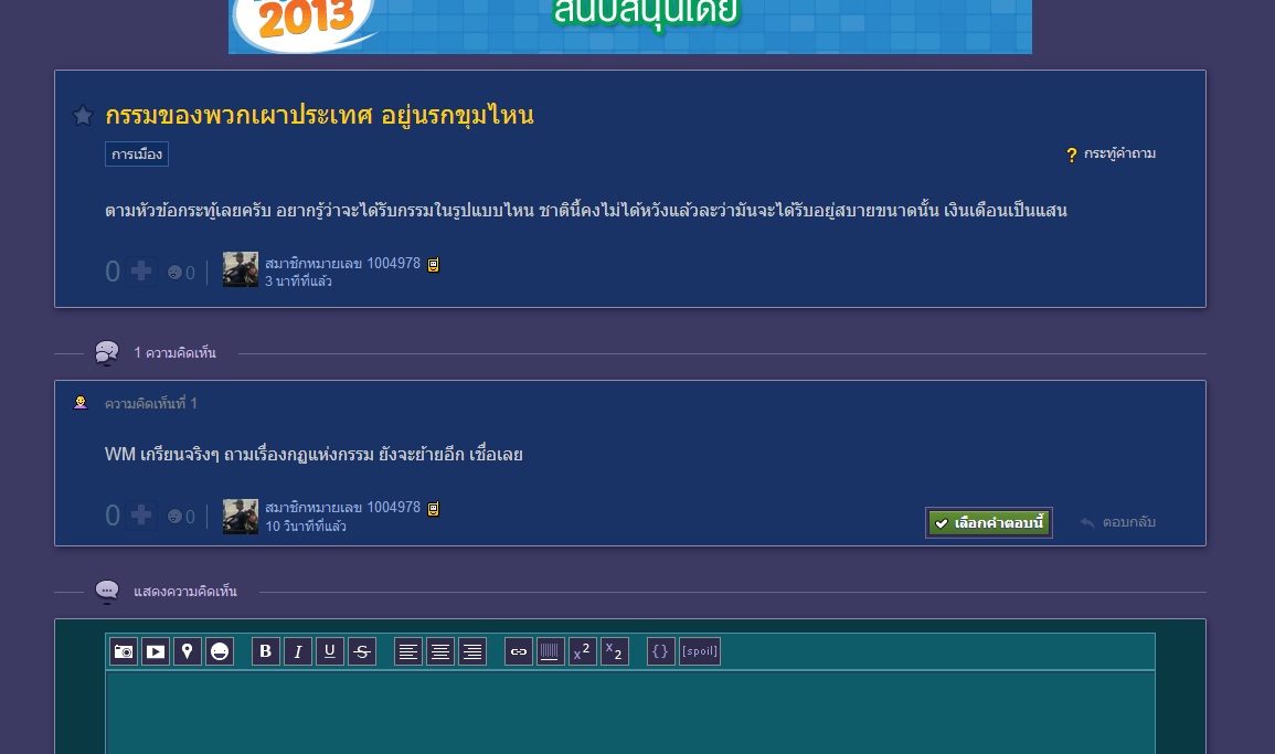เว็บมาสร์เตอร์เกรียนไปไหมครับ ผมถามเกียวกับกฏแห่งกรรมทำไมต้องย้ายไปการเมือง