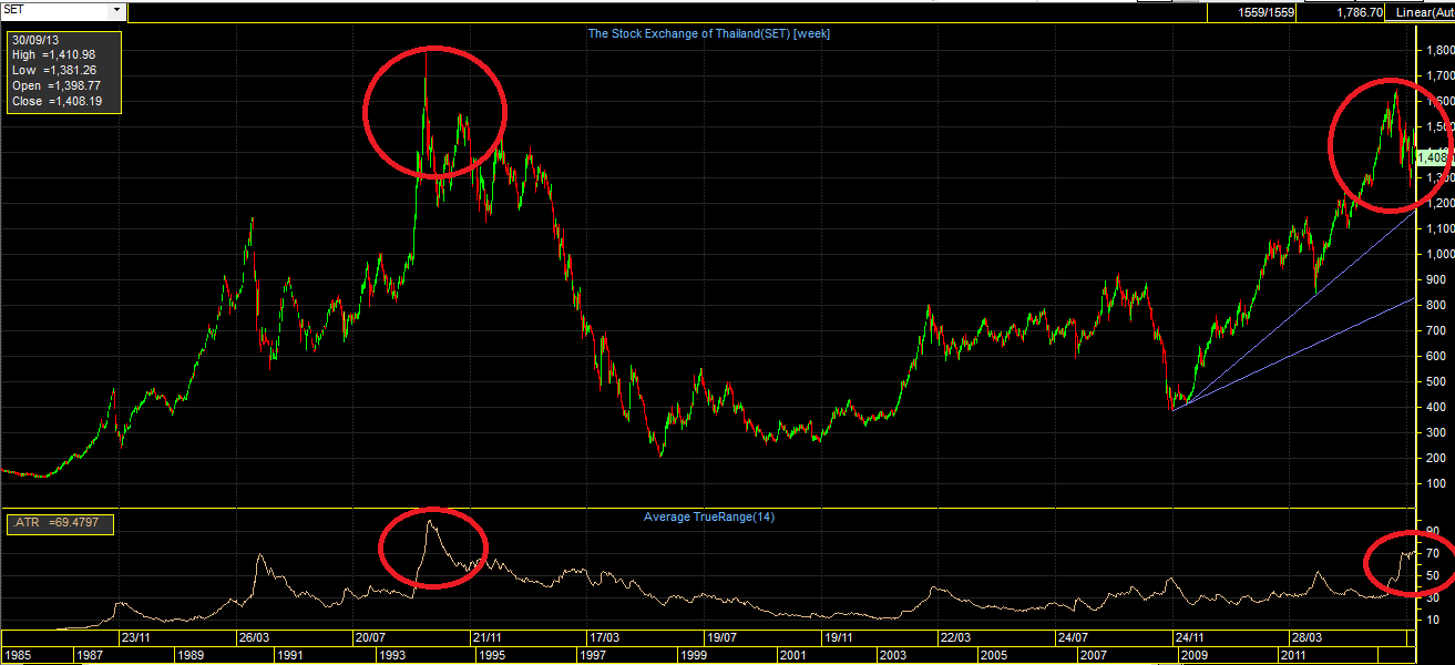 ลองมาเทียบ average true range ในระดับสัปดาห์ ณ ตอนนี้มันเป็นรองแค่สมัยก่อนต้มยำกุ้งไม่กี่ปี