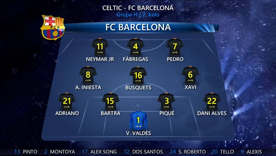 FC Barcelona Line-up : Pinto, Montoya, Mascherano, Puyol, Adriano, Busquets, Sergi Roberto, Iniesta, Pedro, Cesc,Alexis: Bench Barcelona: Valdes, Pique, Alba, Song, Xavi, Messi, Tello