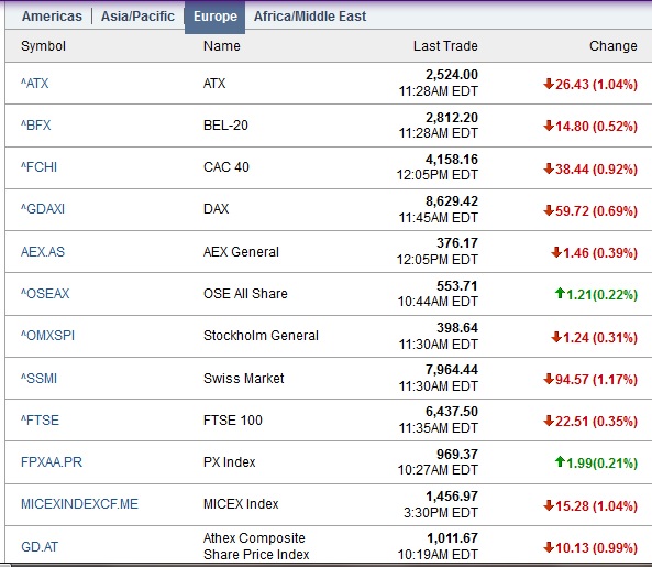 ตลาดหุ้นยุโรปปิดร่วงเมื่อคืนนี้ (2 ตุลาคม 2556) ดัชนี Stoxx Europe 600 ร่วงลง 0.7% ปิดที่ 310.79 จุด ซึ่งเป็นการปรับตัวลงมากที่สุดนับตั้งแต่วันที่ 30 สิงหาคมปีนี้ ดัชนี DAX ตลาดหุ้นเยอรมันปิดที่ 8,629.42 จุด ลดลง 59.72 จุด หรือ -0.69% ดัชนี CAC-40 ตลาดหุ้นฝรั่งเศสปิดที่ 4,158.16 จุด ลดลง 38.44 จุด หรือ -0.92% ดัชนี FTSE 100 ตลาดหุ้นลอนดอนปิดที่ 6,437.50 จุด ลดลง 22.51 จุด หรือ -0.35%