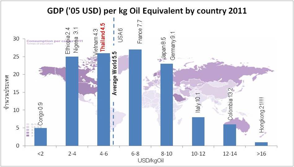 จากภาพข้างต้น ประเทศไทยเราใช้น้ำมันดิบ 1 กิโลกรัม เผา เกิดเป็นรายได้ 4.5 เหรียญ หรือประมาณ 135 บาท ในขณะที่ ฮ่องกง เขาใช้น้ำมันดิบ 1 กิโลกรัม เกิดเป็นรายได้ถึง 630 บาท ซึ่งหมายถึงว่า เขาใช้พลังงานได้มีประสิทธิภาพมากกว่าประเทศไทย 4.6 เท่า และ ประสิทธิภาพการใช้พลังงานของประเทศไทย ต่ำกว่าค่าเฉลี่ยของโลก ที่ 5.5 เหรียญ ต่อน้ำมัน 1 กิโลกรัม [2]