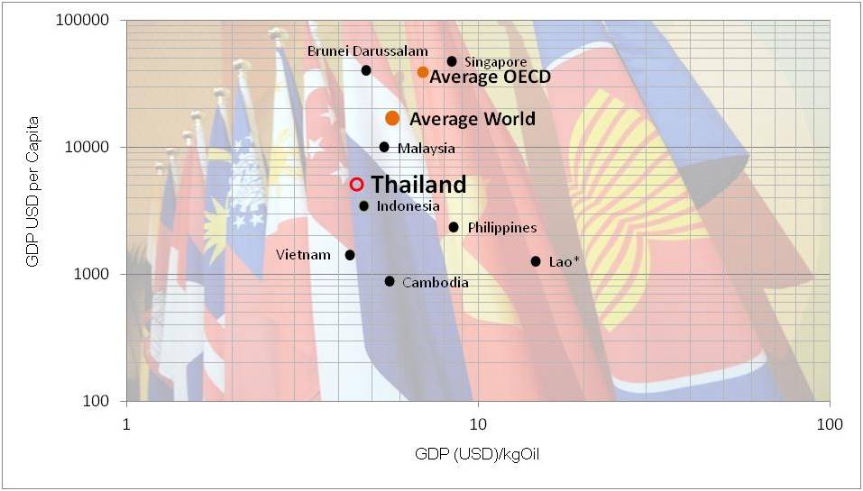 สำหรับประเทศไทย เทียบกับค่าเฉลี่ยของโลก เรามีรายได้ต่อหัว ต่ำ และประสิทธิภาพการใช้พลังงานของเราก็ยังไม่ดีนัก แถมซ้ำร้าย เมื่อเทียบกับประเทศเพื่อนบ้านในประชาคมเศรษฐกิจอาเซียน แม้ เราจะมีรายได้ต่อหัวค่อนข้างสูง แต่ประสิทธิภาพการใช้พลังงานเชิงเศรษฐศาสตร์ของเราก็ยังต่ำกว่าประเทศเพื่อนบ้านของเรา