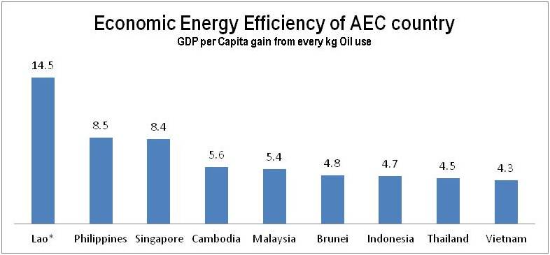 ประสิทธิภาพการใช้พลังงานที่ต่ำ นั่นอาจเป็นเพราะการที่เราเป็นประเทศอุตสาหกรรมเทียบกับ สปป ลาว กับ กัมพูชา ภาคอุตสาหกรรมมักจะมีการใช้พลังงานต่อผลผลิตสูงกว่าภาคเกษตรกรรม ในขณะที่เทคโนโลยีการผลิตเชิงอุตสาหกรรมในประเทศเหล่านั้นอาจมีประสิทธิภาพต่ำกว่าเราก็เป็นได้ แต่ทั้งนี้ ด้วยการเป็นประเทศอุตสาหกรรม พลังงานสำรองของประเทศไทยก็ย่อมจะถูกใช้หมดไปอย่างรวดเร็วกว่าประเทศเพื่อนบ้าน ที่ยังมีทรัพยากรเหลืออยู่เยอะ และยังมีการเกษตรเป็นตัวหนุนหลังอีก