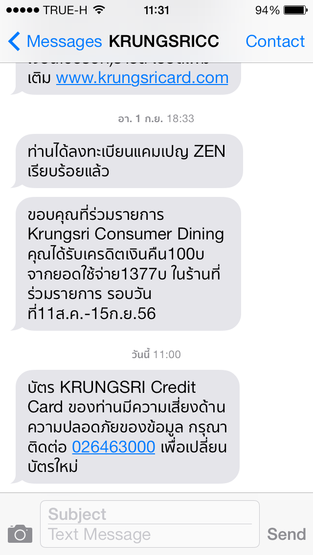 บัตรเครดิตโดน Copy ไปใช้งานที่ต่างประเทศเป็นเรื่องที่ผมเคยได้ยิน และอ่านเจอในพันทิพแต่ก็ไม่คิดเลยว่าวันหนึ่งจะได้มีประสบการณ์โดยตรงกับตัวเองเรื่องของเรื่องคือวันนี้ขณะกำลังจะหยิบโทรศัพท์ขึ้นมาถ่ายรูปเล่นๆก็พบว่ามีข้อความจาก ธ.กรุงศรี เด้งเตือนขึ้นมา