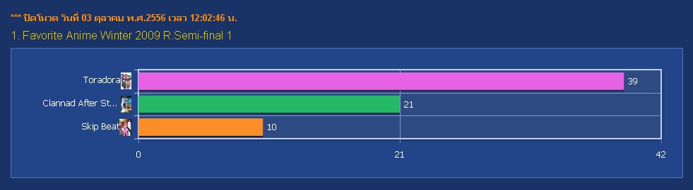 รอบสองก็ปิดโหวตทุกสายเรียบร้อย ขอบคุณทุกท่านที่มาโหวตอนิเมในรอบสองทั้ง2สาย ส่วนผลการโหวตเป็นยังไงก็ไปติดตามได้ครับ สาย A อนิเมที่เข้ารอบก็คือ.... Toradora และ Zoku Natsume Yuujin-Chou สาย B