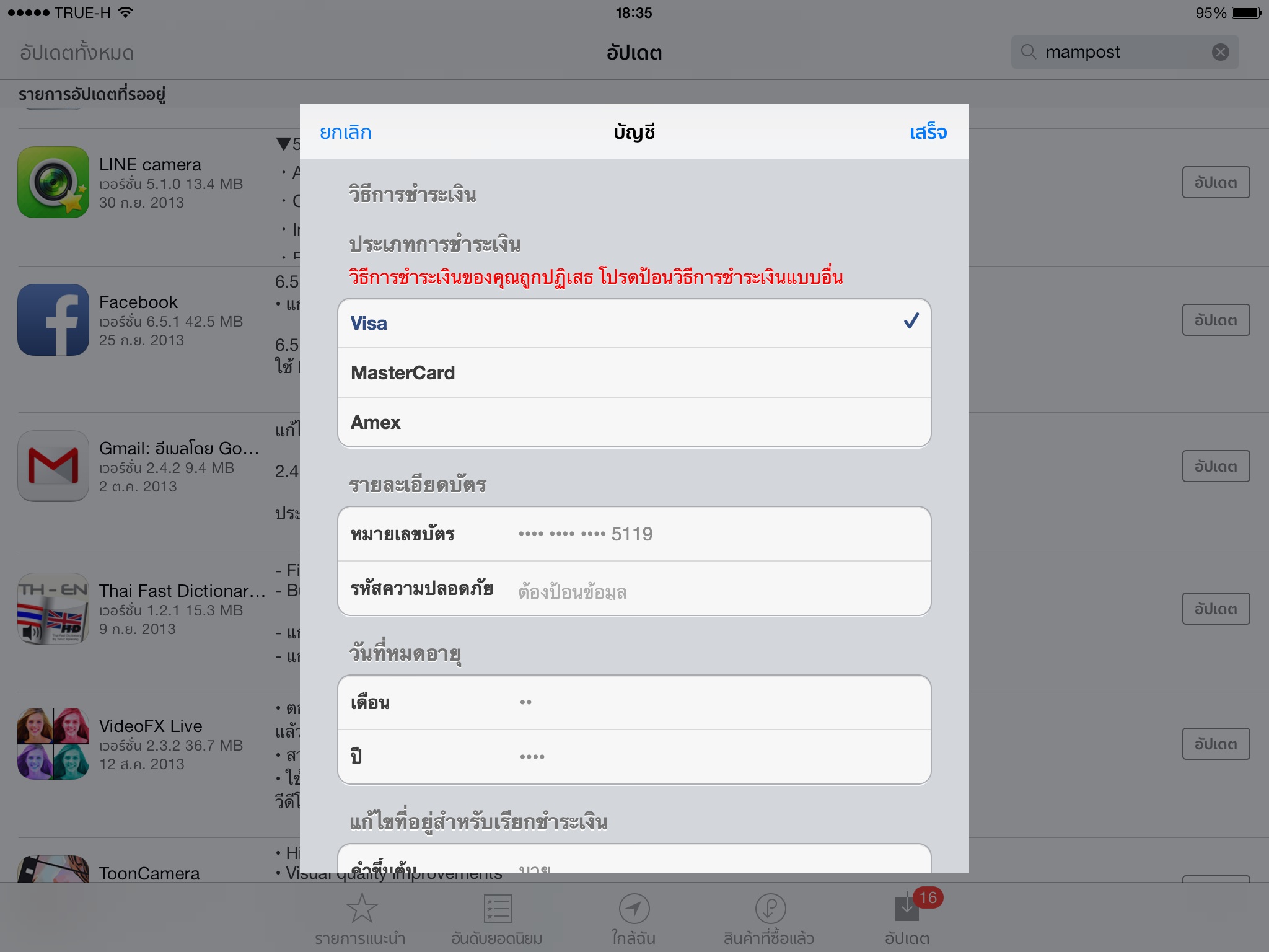 ผมกรอกข้อมูลครบถ้วนแล้วแต่ มันบอก วิธีการชำระเงินถูกปฏิเสธ ทั้งที่เพิ่งชื้อ app เสียเงินไปเมื่อวาน วอนผู้รู้ช่วยที่ครับ ต้องทำอย่างไร