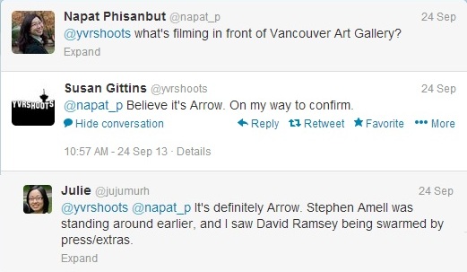 วันนั้น ปรากฎว่านักแสดงหลายคนจาก Arrow มาที่นี่ด้วย ใครอยากดูรูป เชิญที่นี่ค่ะ http://yvrshoots.com/2013/09/shoot-arrow-films-at-the-vancouver-art-gallery.html#.UkToOYZmiSo