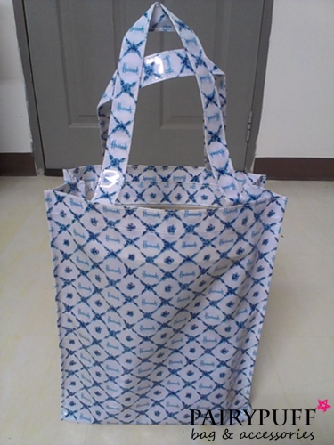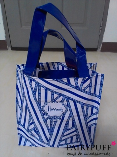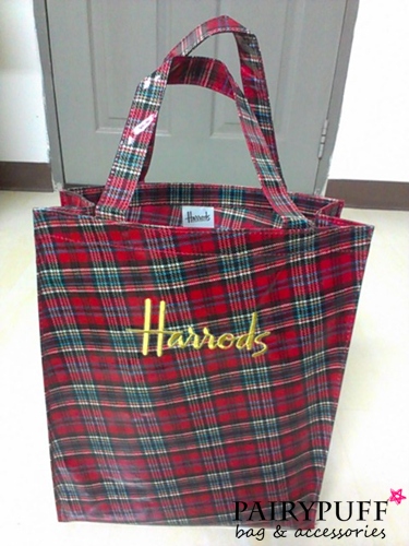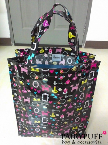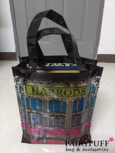 คำว่า'Harrods'ปักด้ายสีเหลืองทอง มีฐานกระเป๋าให้นะคะ