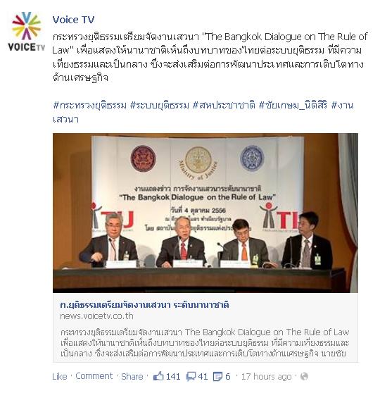 กระทรวงยุติธรรมเตรียมจัดงานเสวนา "The Bangkok Dialogue on The Rule of Law" เพื่อแสดงให้นานาชาติเห็นถึงบทบาทของไทยต่อระบบยุติธรรม ที่มีความเที่ยงธรรมและเป็นกลาง ซึ่งจะส่งเสริมต่อการพัฒนาประเทศและการเติบโตทางด้านเศรษฐกิจ