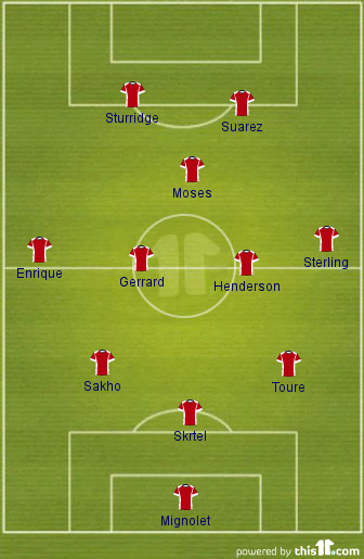Confirmed LFC team v Crystal Palace: Mignolet, Toure, Skrtel, Sakho, Henderson, Enrique, Gerrard, Sterling, Moses, Sturridge, Suarez.