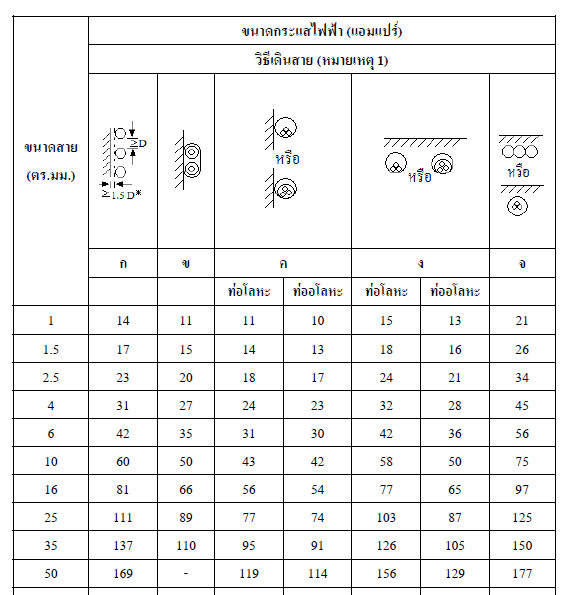 หมายเหตุ . ตามมาตรฐานไฟฟ้าจะอนุญาติให้ใช้ขนาดสายไฟไม่เกินพิกัดกระแส 80% ของวิธีการเดินสายไฟเเบบต่างๆ